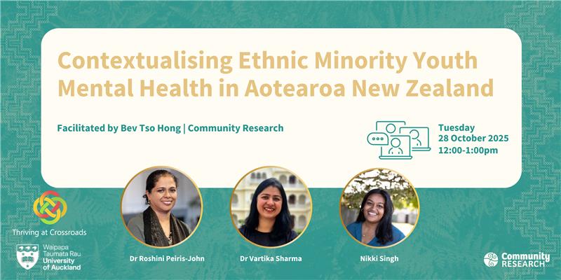 | | Contextualising Ethnic Minority Youth Mental Health in Aotearoa New ZealandWe are excited to bring you this webinar from the Thriving at Crossroads (T@C) research team at the University of Auckland. Tuesday 28 October 12noon-1.00pm