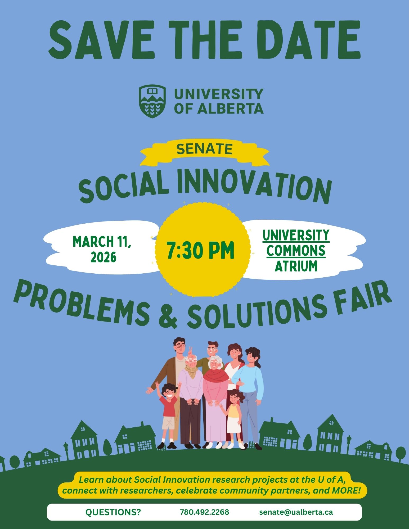| | YOU'RE INVITED The University of Alberta Senate is delighted to invite you to attend our inaugural Social Innovation Problems and Solutions Fair on March 11! Social Innovation in research tackles the complex social problems impacting communities within Alberta in innovative ways. To help foster and celebrate the creative research addressing Albertans’ everyday challenges, we are bringing researchers together with community members to share their projects in a quick and understandable format. Date: Wednesday, March 11, 2026 Time: 7:30PM Location: University Commons Atrium (complimentary parking available) |