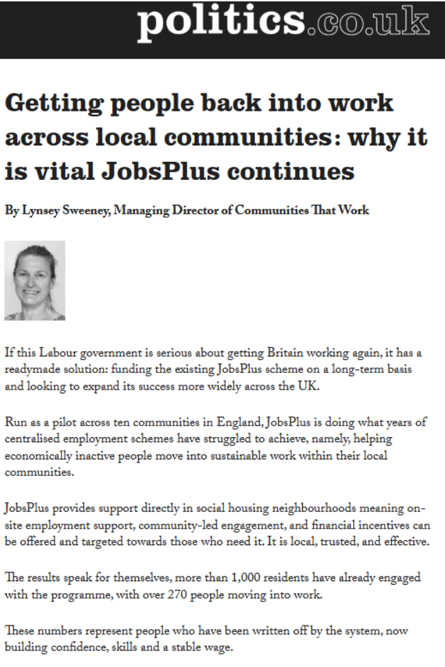 Sitting as a local board member for Jobs Plus in Bidston Rise, you can see the power of bringing a range of partners to the table over a shared vision. Collectively, there is a wealth of knowledge, networks and resources from partners across a range of sectors, including; Community, Youth, Housing and Local Authority. I've seen firsthand how this has enabled the team to support residents beyond just 'employment' to meet their needs and aspirations. The Jobs Plus project and team have seen some strong indicators of success through a truly collaborative approach in the community; an acknowledgement that no complex challenges like these can be solved in isolation.